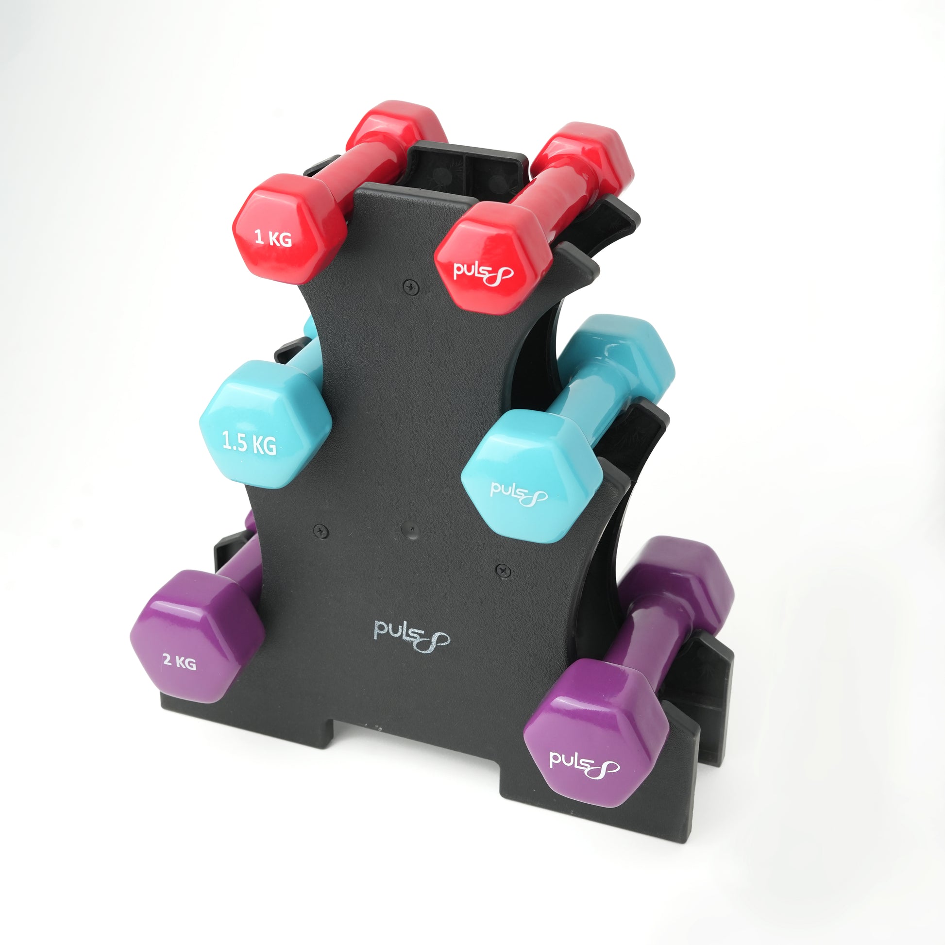 Organize your dumbbells with the Puls8 Vertical Tree PVC Dumbbell Stand. Save space, keep your workout area tidy, and easily access your weights. A must-have for any home gym!